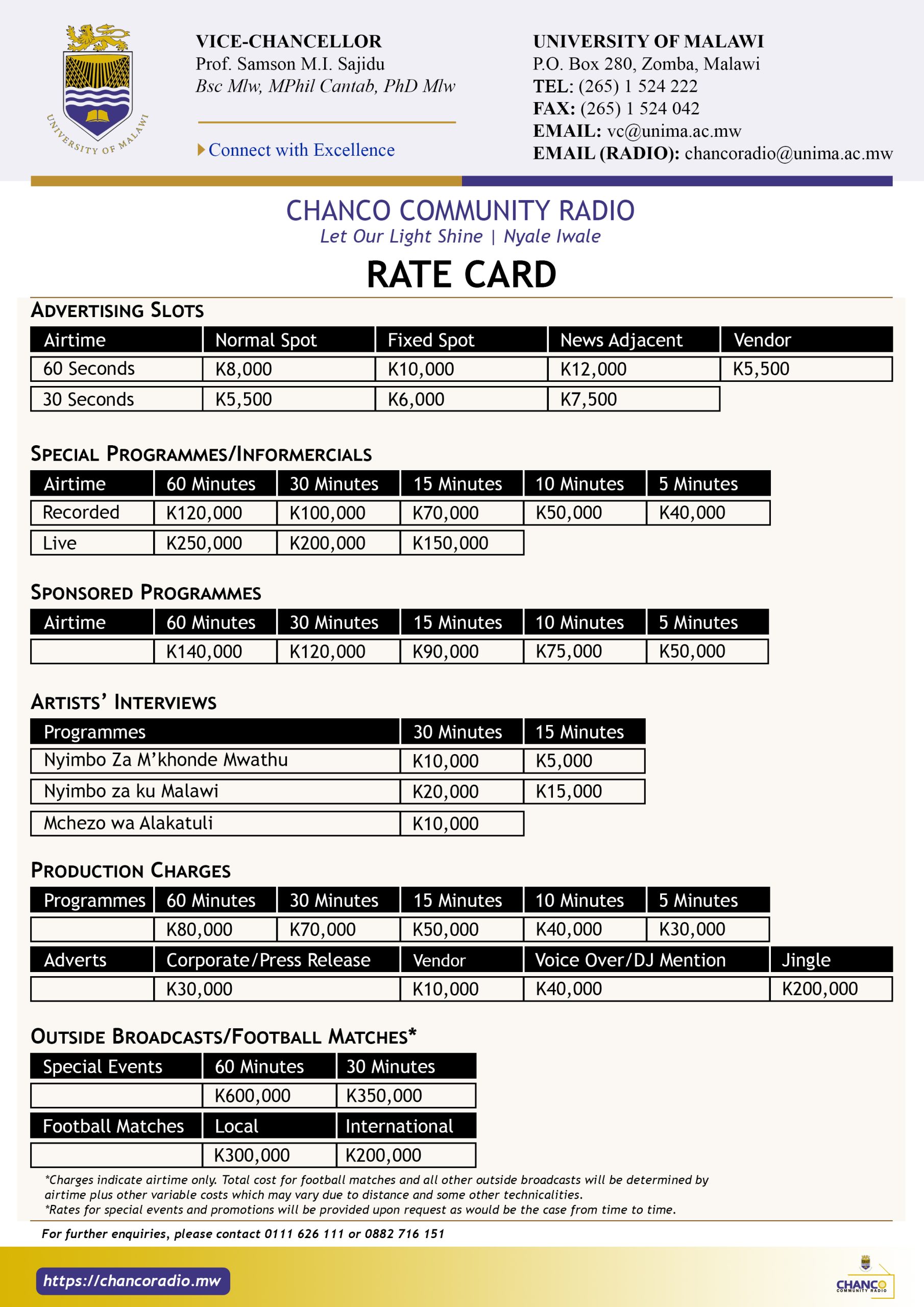Chanco Community Radio is owned and run by the University of Malawi and is the first environmental radio station in Malawi. The radio station was established by the University of Malawi with funding from the Royal Norwegian Embassy through the Lake Chilwa Basin Climate Change Adaptation Program (LCBCCAP), which was run by the Department of Forestry through the Forestry Research Institute of Malawi (FRIM), WorldFish, and Leadership for Environment and Development – Southern and Eastern Africa (LEAD-SEA).